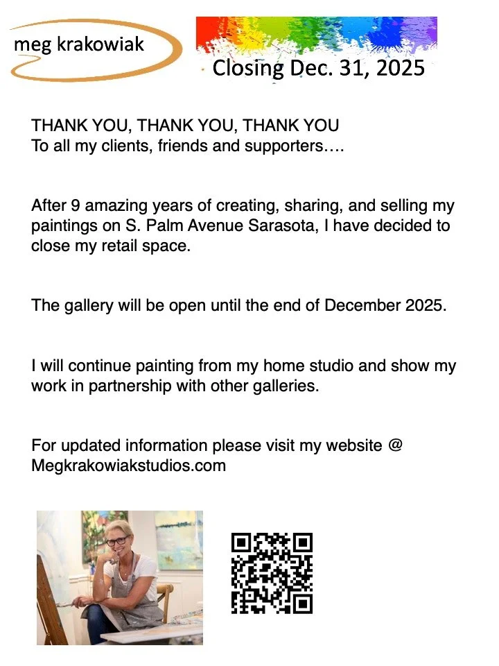 “I am thrilled to be a permanent resident of Sarasota and part of the vibrant art scene that is cultivated here. There are many ways to get involved, grow and giveback.”
