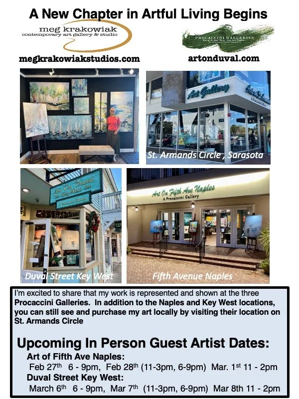 In 2010, Meg launched a unique business model combining her working studio and retail gallery into one space. Located on historic Palm Avenue in downtown Sarasota, Florida, her studio allowed visitors to watch her paint and experience the creative process firsthand. After more than a decade of welcoming visitors into this cherished space, Meg transitioned from her Palm Avenue gallery to focus on creating from her private studio, now working exclusively with both Procaccini Galleries in Sarasota, Naples and Key West Florida and Art Highlands in North Carolina.